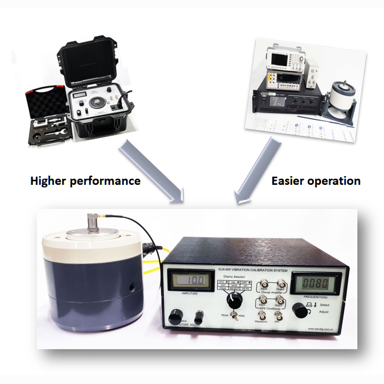 This device can be used to calibrate vibration accelerometer, velocity and proximity transducer and vibration measuring instrument. Standard sine signal vibration at any frequency from 1Hz to 10 kHz can be defined. The amplitude of the acceleration, velocity and displacement, can be defined through potentiometers and shown on digital displays. Velocity value display Peak/RMS selectable. Combines sine signal generator, power amplifier, standard transducer, vibration meter, shaker, IEPE and Charge Conditioners in one and features a small volume, high accuracy and easy operation. It can be used either in laboratory or on site.