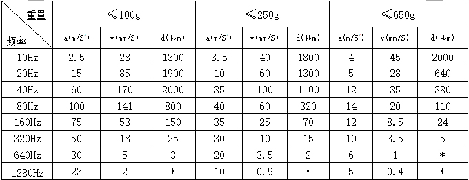 * 在频率较高时,因振动位移数值很小,所以,在这几点上,校准仪无振动信号输出。 |